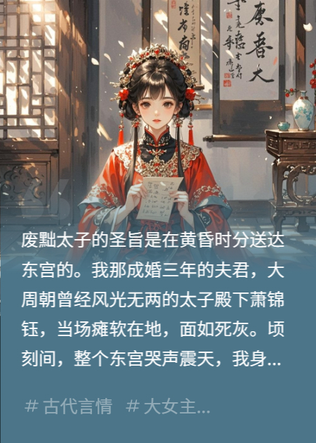 [11-12 15:52] 废了皇后,皇帝被宠妃玩死了 我是将军独女。婚后,太子怕父皇说他勾结将门,哄骗我喝下断子汤。为了让他绵延子嗣,我不得不给他挑选...