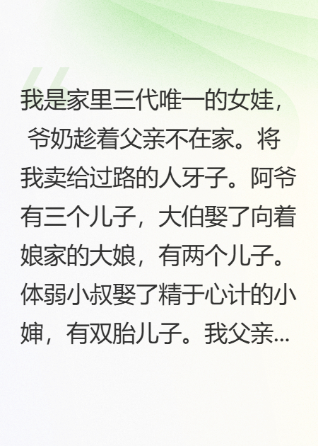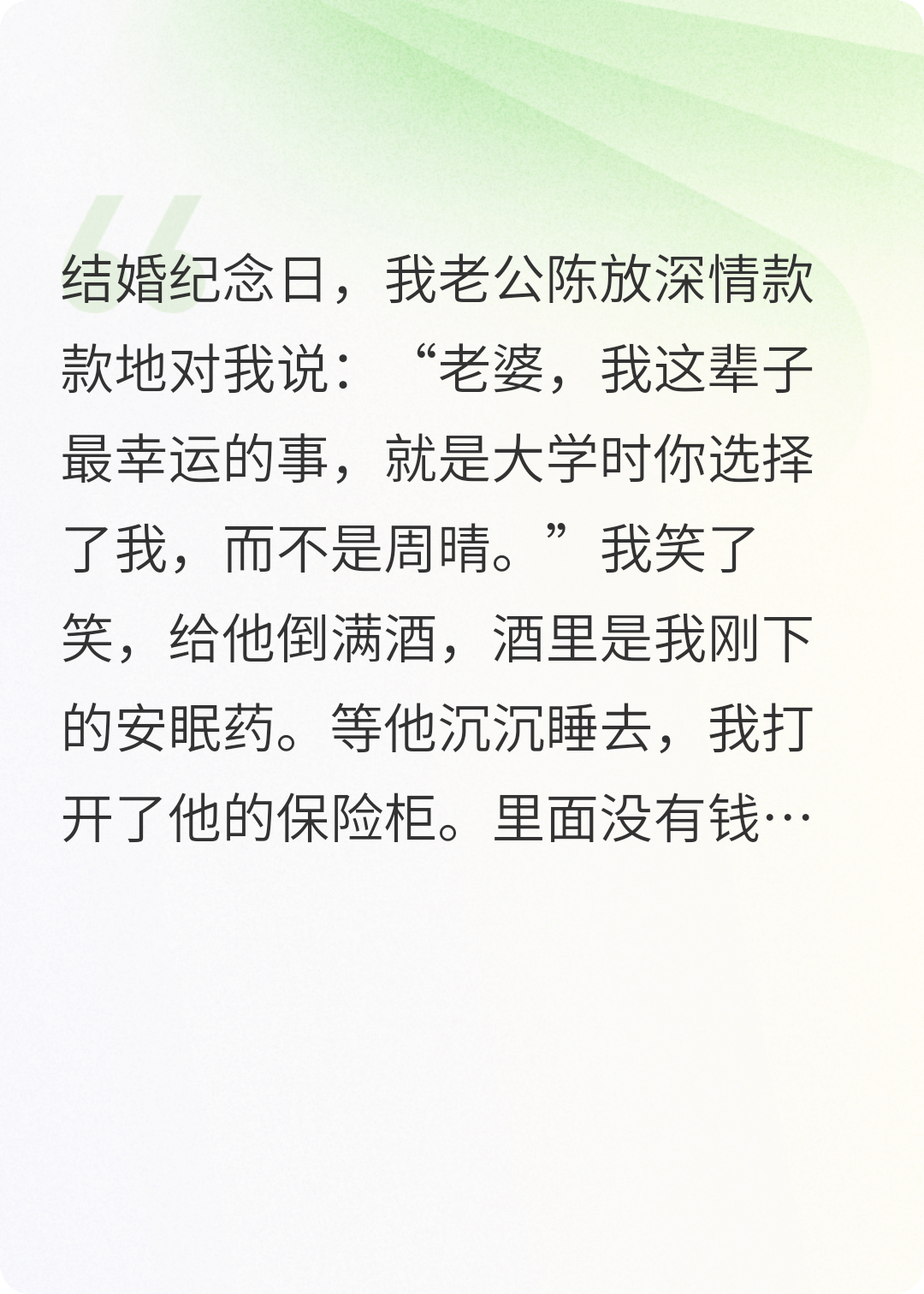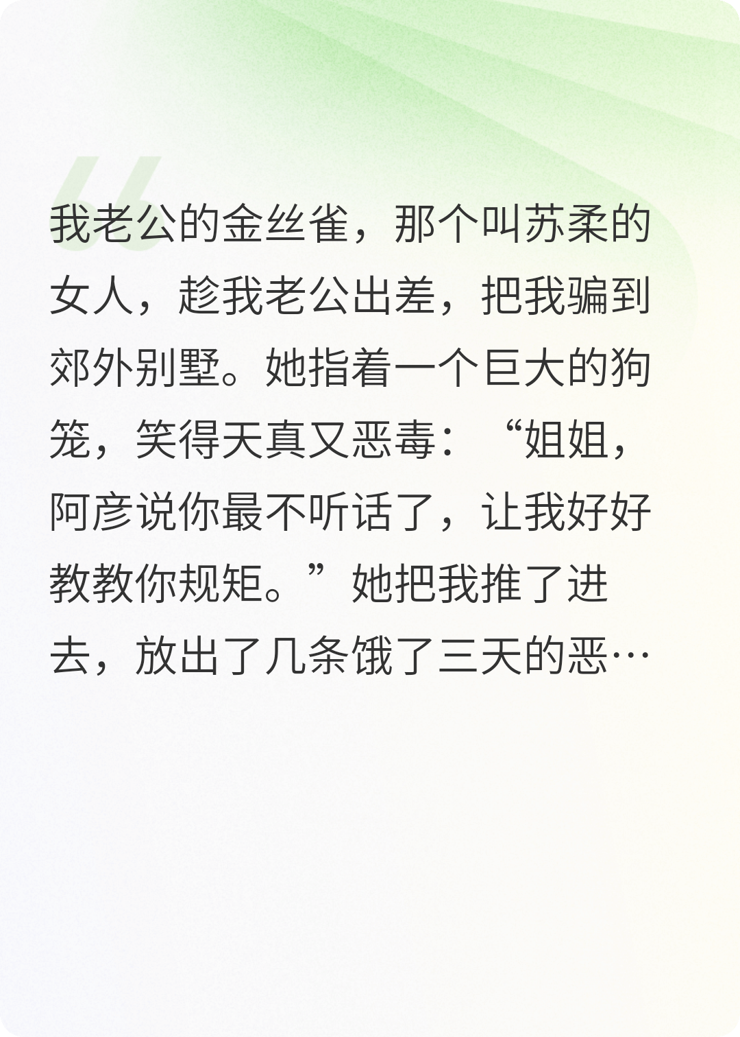 [11-12 15:52] 婆婆假死骗房产,我让她变假成真 婆婆确诊胃癌晚期,我含泪卖掉父母留给我唯一的婚房,凑了480万救命钱。可转头,我就在小叔子的朋友圈...